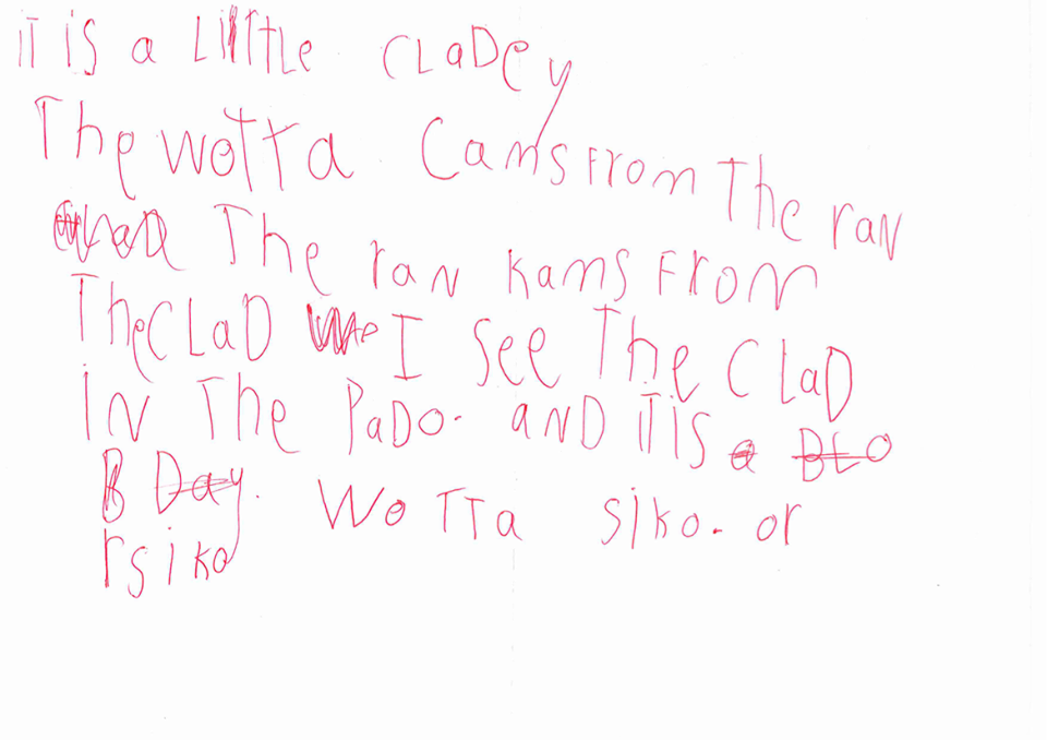 "It is a little cloudy. The water comes from the rain. The rain comes from the cloud. I see the cloud in the puddle. It is a water cycle, recycling." Katiya age 6.